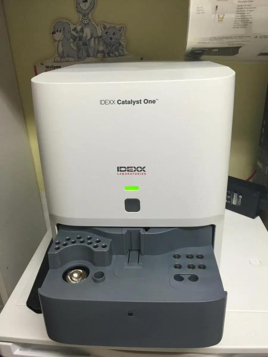 Bild einer Tierarztpraxis mit einem mobilen Behandlungstisch. Auf dem Tisch stehen ein Gerät mit Knöpfen sowie ein weiteres Gerät mit einem Display. Der Tisch ist aus Metall und hat Rollen.